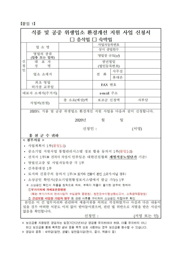| 음식 및 숙박업소의 환경개선을 통한 식품·공중 위생향상 도모 및 홍천군을 찾는 관광객에게 편안하고 쾌적한 숙식을 제공하고자, 음식 및 숙박업소 환경개선 지원사업 신청자 모집을 다음과 같이 공고하오니 많은 관심과 신청바랍니다. 1. 공고기간: 2020. 2. 14. ~ 2. 26. (13일간) 2. 신청기간: 2020. 2. 27. ~ 3. 11. (14일간) 09:00 ~ 18:00 3. 사업기간: 2020. 3 ~ 8월 4. 신청대상: 신청일 현재 홍천군에 6개월 이상 영업주의 주소와 영업장이 있는 자로서 아래의 조건을 충족 - 음식업소: 「식품위생법」 시행령 제21조에 따른 일반음식점 - 숙박업소:「 공중위생관리법」 제2조에 따른 숙박업소 | |||